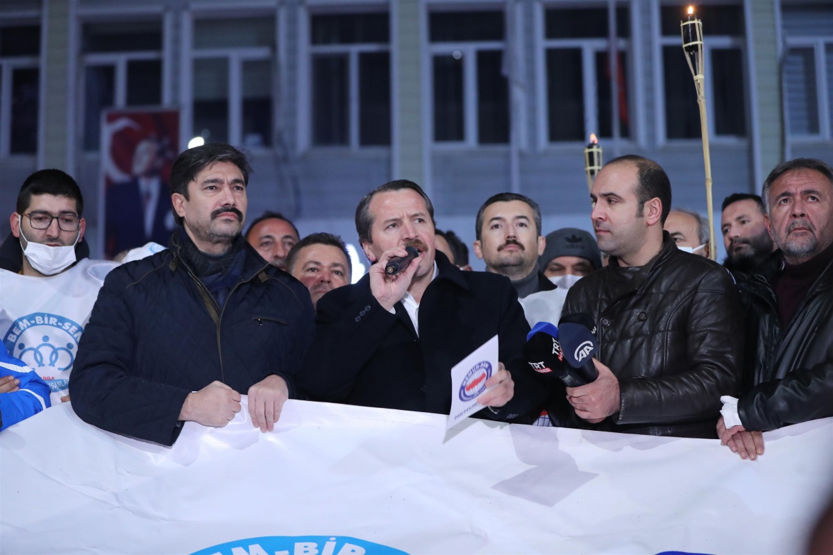 CHP’li belediyelerin yerel seçimlerden bugüne kadar toplam bini aşkın sözleşmeli kamu personelini işten çıkardığını, yargı kararıyla işine geri dönenlerin bile tekrar işine son verildiğine dikkat çeken Ali Yalçın, her siyasi tablo değiştiğinde insanların ekmeği ile de oynanmaması için sözleşmelilerin kadroya geçirilmesi adına mücadele verdiklerine dikkat çekerek, “Memurun işten çıkarılması bu kadar basit olmamalı. Statü hukukunun güvencesinde olması gereken memurun iş güvencesi belediye başkanlarının iki dudağı arasında olmamalı. Buradaki direniş emek içindir, ekmek içindir, iş güvencesi içindir. Bu sesi herkes duymalı, Hiç kimse bu sesi susturamaz, kısamaz. Biz buna müsaade etmeyiz. Biz bu işin peşini bırakmayacağız. Bu sese ses, mücadeleye omuz vermeye devam edeceğiz. Gerekirse burada çadırımızı kurar; iş ve aş nöbeti, ekmek ve emek nöbeti tutarız. Biz bunun için varız, kardeşlerimizin haklı davalarının yanındayız. Direnişimiz sürecek. Emekçi kıyımına geçit vermeyeceğiz” diyerek konuşmasını tamamladı.